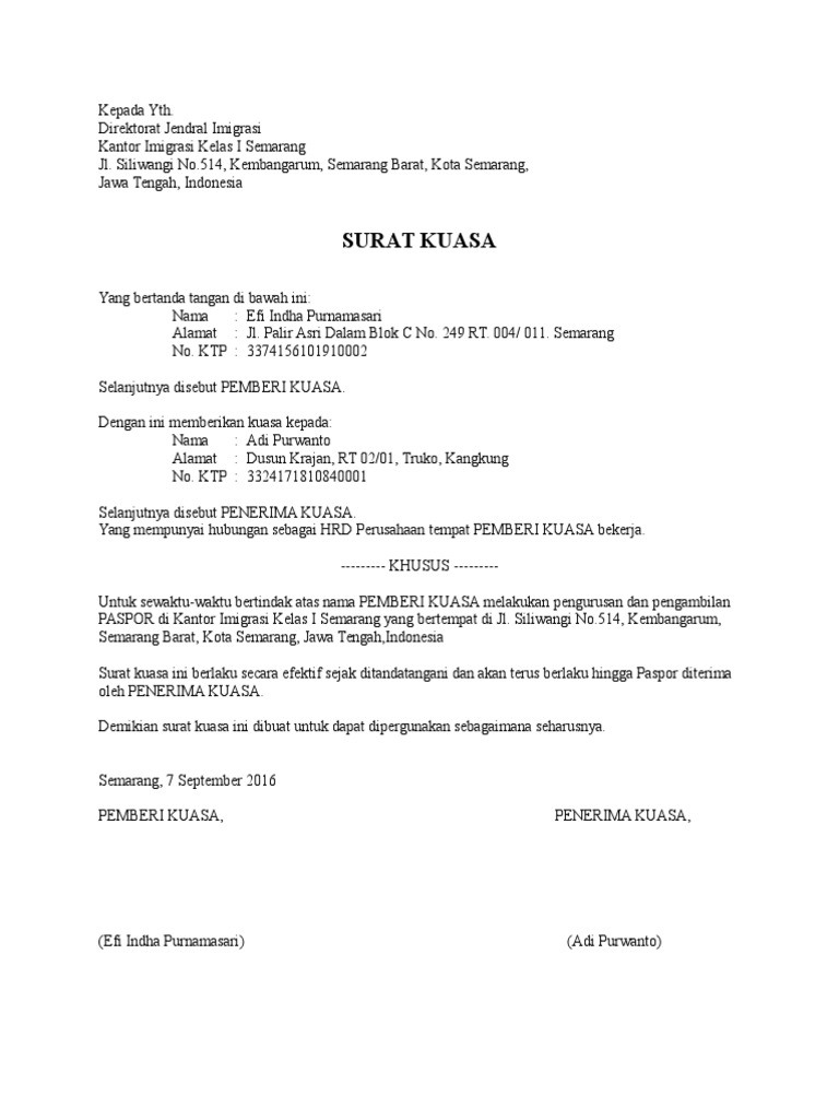 Surat kuasa yang dibuat biasanya hanya terdiri atas satu rangkap, namun untuk tujuan arsip dan kepentingan sebuah penerima kuasa bisa menahan penyerahan uang hasil penagihan, hingga pemberi kuasa memberikan upah penagihan. Sebagai contoh surat kuasa perseorangan yaitu ketika ada seseorang yang membuat surat kuasa dengan tujuan untuk meminta gaji pensiunan. Contoh surat kuasa bank pengambilan uang pensiun. Dan jika diperlukan anda bisa membawa juga sura kuasa untuk. Surat kuasa merupakan keterangan tertulis yang.