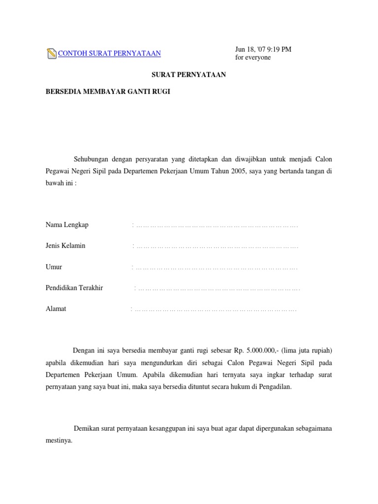Bagi sebuah instansi baik pemerintahan maupun swasta, suatu pernyataan akan lebih baik disampaikan secara tulisan daripada hanya sebatas lisan. Contoh surat pernyataan kesanggupan, perjanjian, penyesalan, bebas narkoba, dll. Di bawah ini saya sertakan contoh surat pernyataan kesanggupan berbentuk word yang bisa kamu edit langsung. Surat pernyataan sanggup membayar berikut ini anda bisa lansung copypaste contoh surat pernyataan sanggup membayar contoh surat pernyataan sanggup membayar biaya pengobatan. Itulah contoh surat pernyataan kesanggunpan yang bisa kamu jadikan acuan untuk membuat pernyataan yang semisal.
