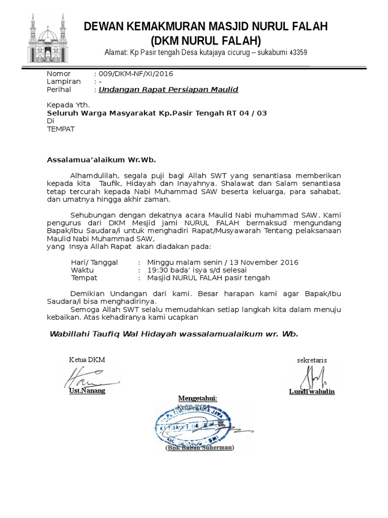 Contoh Surat Undangan Rapat Pengurus Masjid - Contoh Surat Undangan Rapat Pertemuan - Contoh Surat Untuk ... : Kami selaku pengurus rt sangat mengharapkan kehadiran bapak dan ibu pada rapat ini.. Kita tahu contoh surat undangan adalah sebuah tulisan di dalam kertas yang memuat ajakan kepada orang lain baik perorangan maupun kelompok untuk. Bapak/ibu pengrus masjid nurul amin. Untuk itulah surat undangan rapat sangat diperlukan. Panitia pemilihan ketua rukun tetangga (rt) 02 rw 11. Ini adalah contoh surat undangan rapat ketua rt dan pengurusnya.